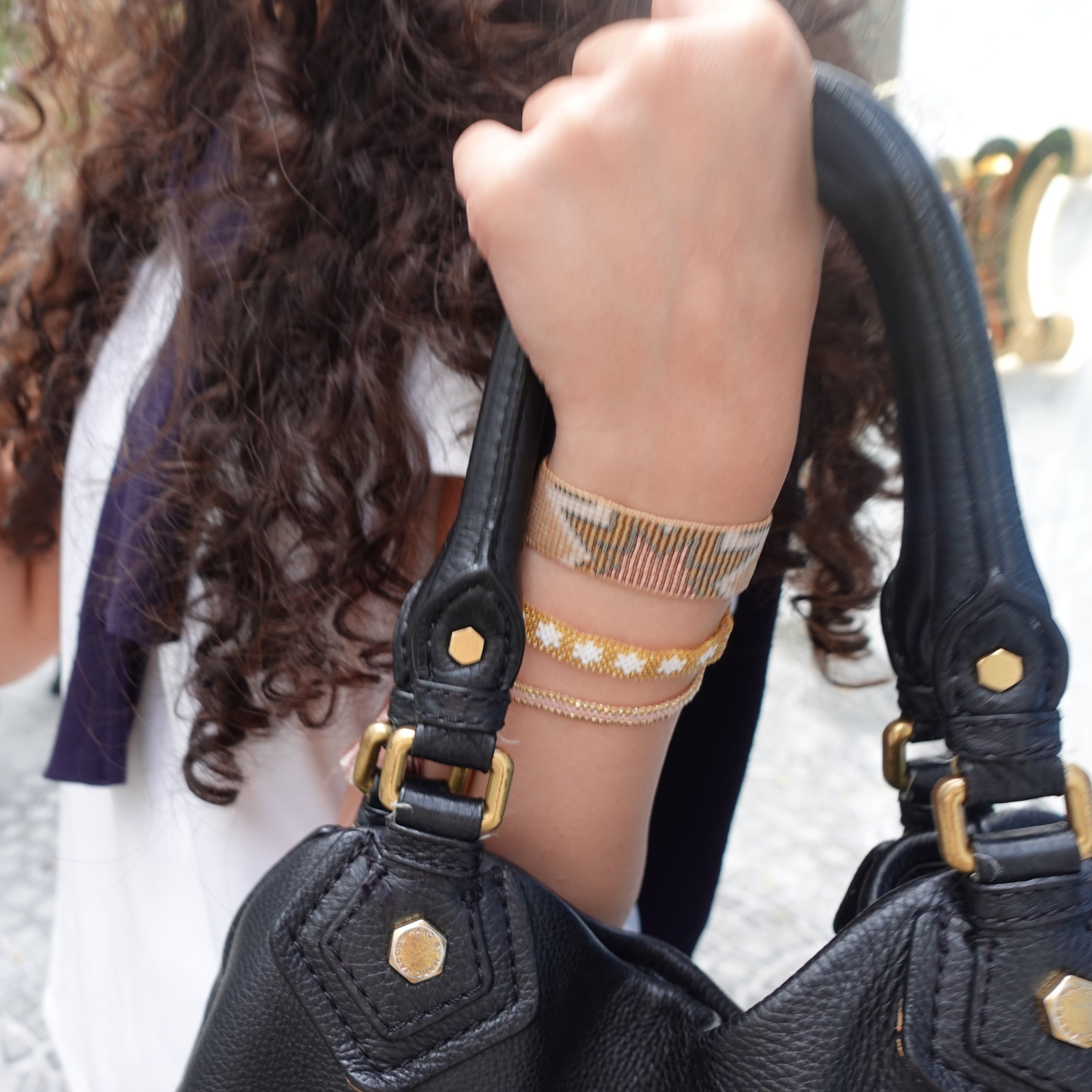 She wears the All Star bracelet in white and gold, Camile bracelet in baby pink, and Edge Line in pink.
